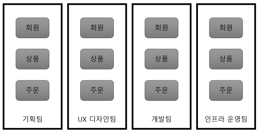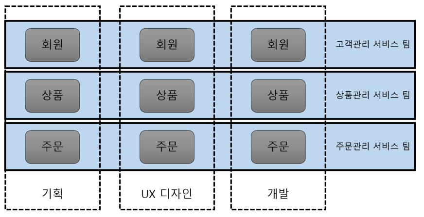 기존의 팀모델은 역할별로 구분했다. 인력관와 운영에 유연성을 부여하지만 팀간의 커뮤니테이션이 원할하지 않고 협업에 걸리는 시간이 지연되기도 한다.