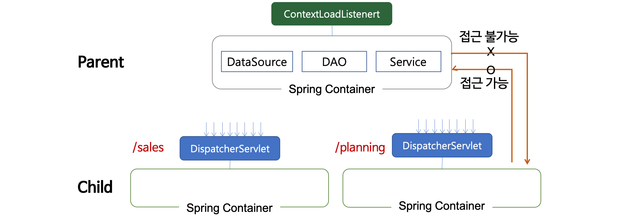- DispatcherServlet에 의해 생성된 Bean은 ContextLoaderListener에 의해 생성된 Bean을 참조할 수 있다.
